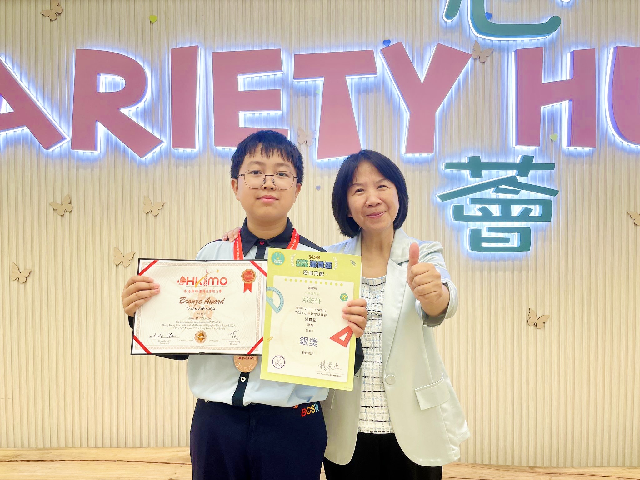 6B班鄧懿軒同學在高手雲集的在 Fun Fun Arena 2025 小學數學挑戰賽 滿貫盃決賽勇奪殊榮,榮獲銀獎!在「香港國際數學競賽2025總決賽」中也表現出色,榮獲銅獎!可見他憑藉紮實的數學功底和沉穩的臨場表現,在國際舞台上綻放光彩,為校爭光!期待同學們未來再創佳績!