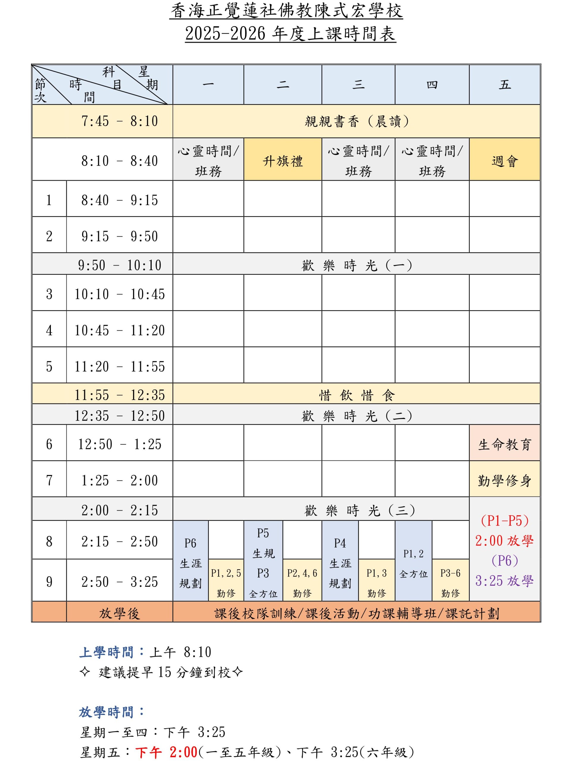 上課時間表