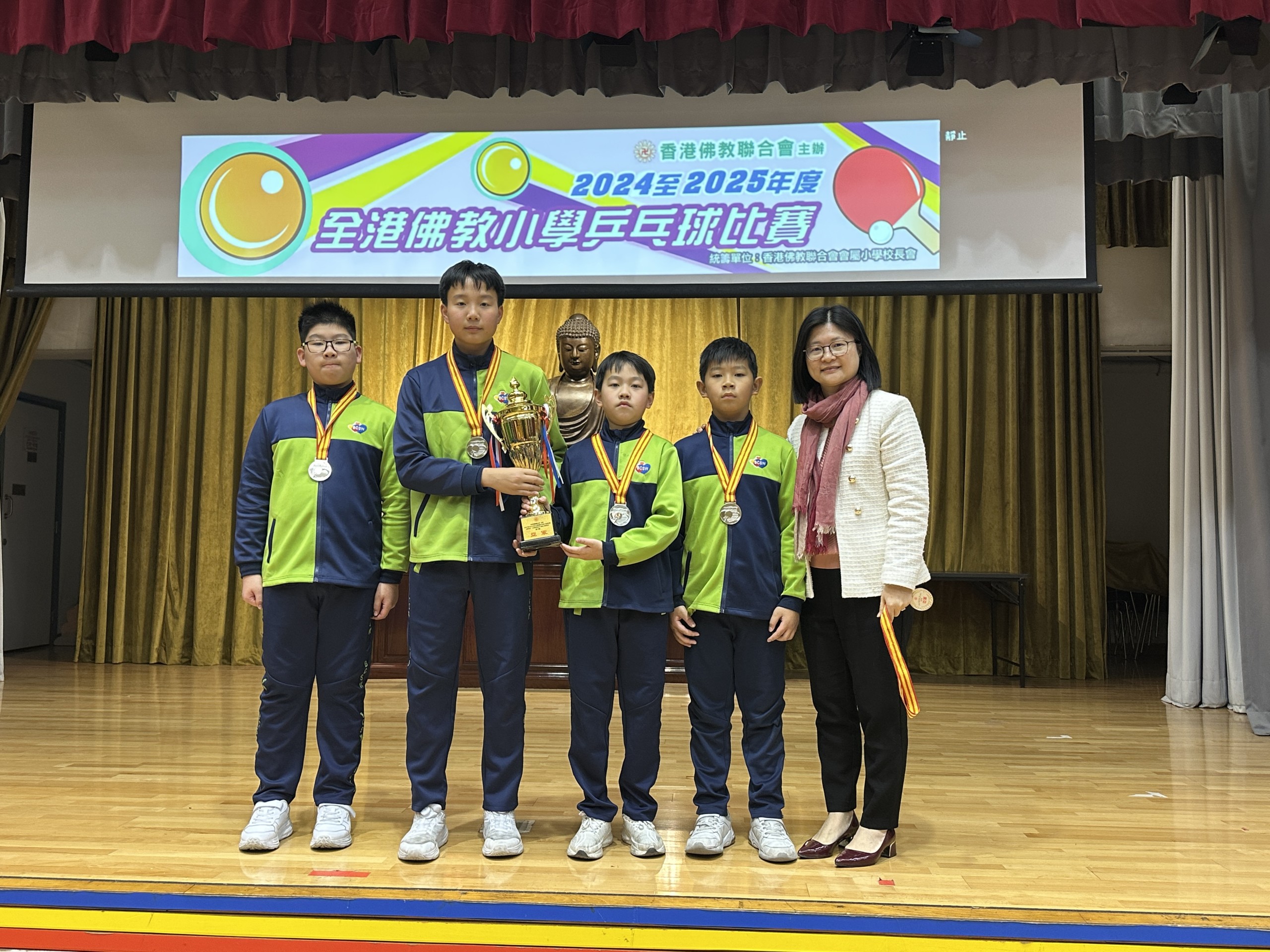| 在2024至2025年度全港佛教小學乒乓球比賽中,5A唐子朗、5C林顯壹、5D吳嘉謙和 6C卓彥宇勇奪男子團體亞軍。 | |