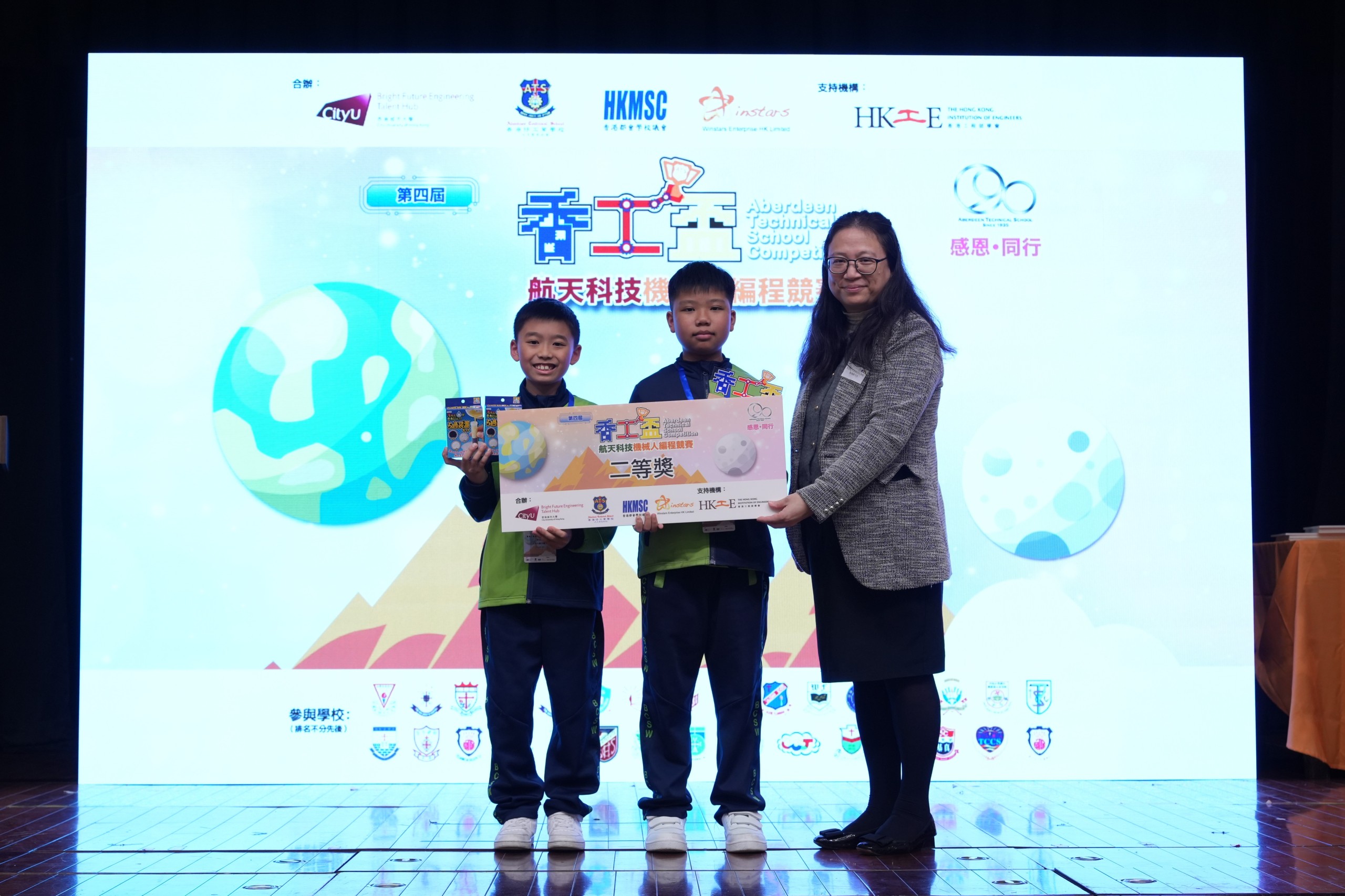 | 葉天翔和許汶灝在「第四屆香工盃航太科技機械人編程競賽」得到二等獎。 |
