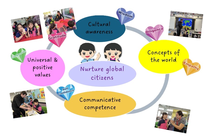 We endeavour to create a better future with a sustainable, diversified and peaceful world. Students will be equipped to possess a heightened cultural awareness, shared responsibilities, empathy and different positive values. Also, we hope they will be able to use English to share and pass on culture of the global village.