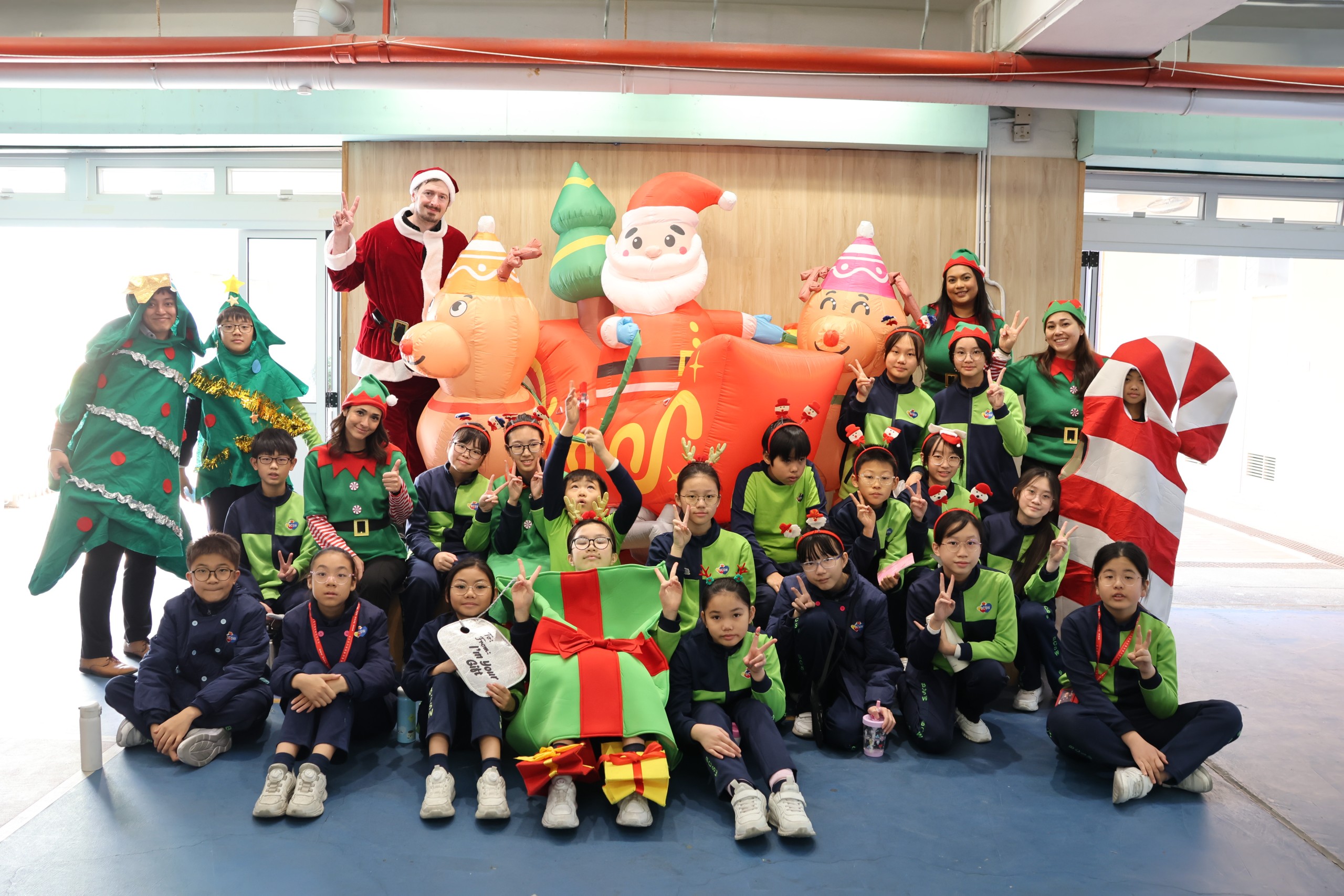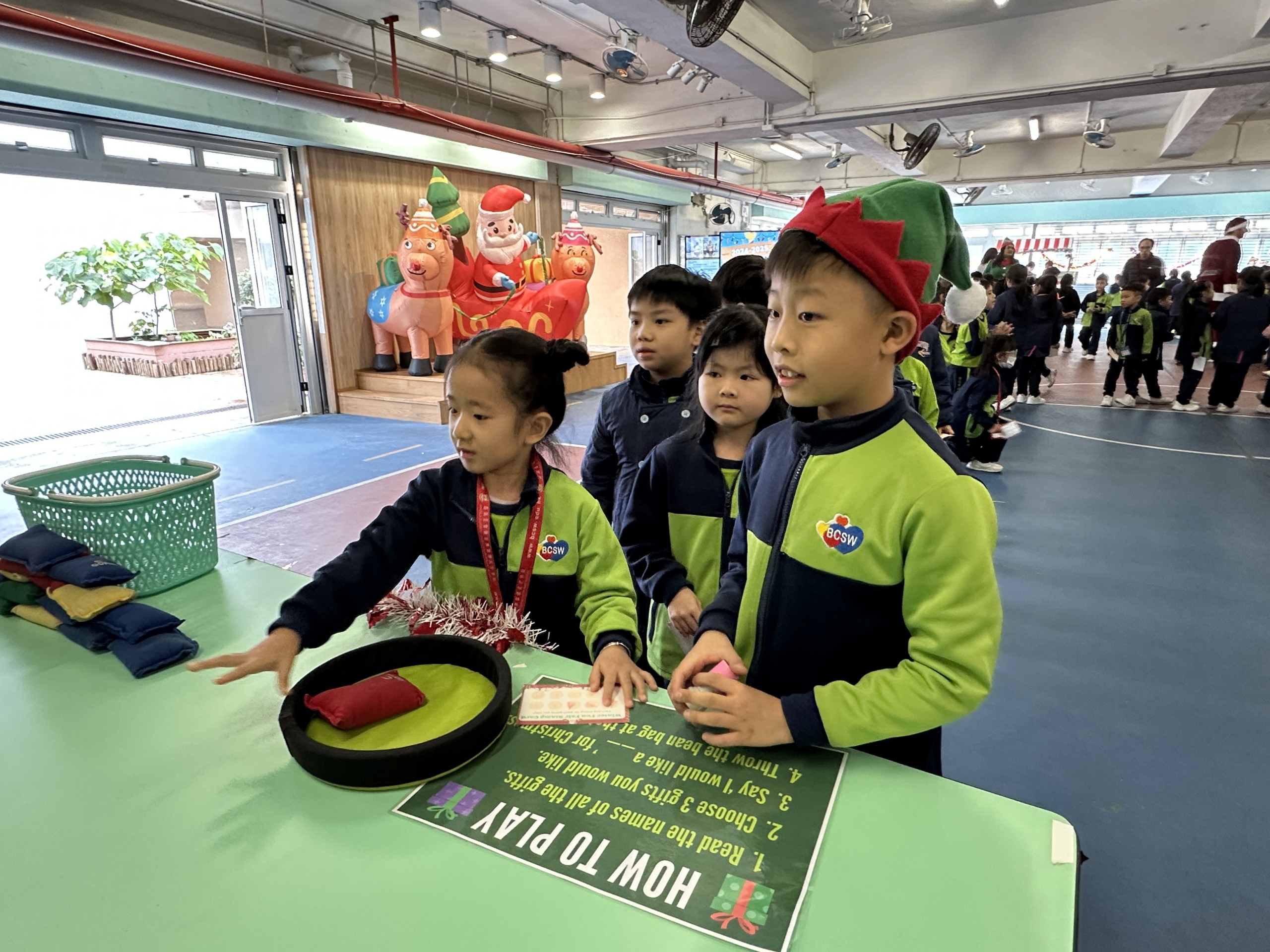 Students of all levels come to the covered playground to enjoy winter-themed fun while using their English skills in various activities. Additionally, they watch a Christmas show about the "Three Acts of Goodness." Through the show, they learn that Christmas means sharing love, not just receiving presents.