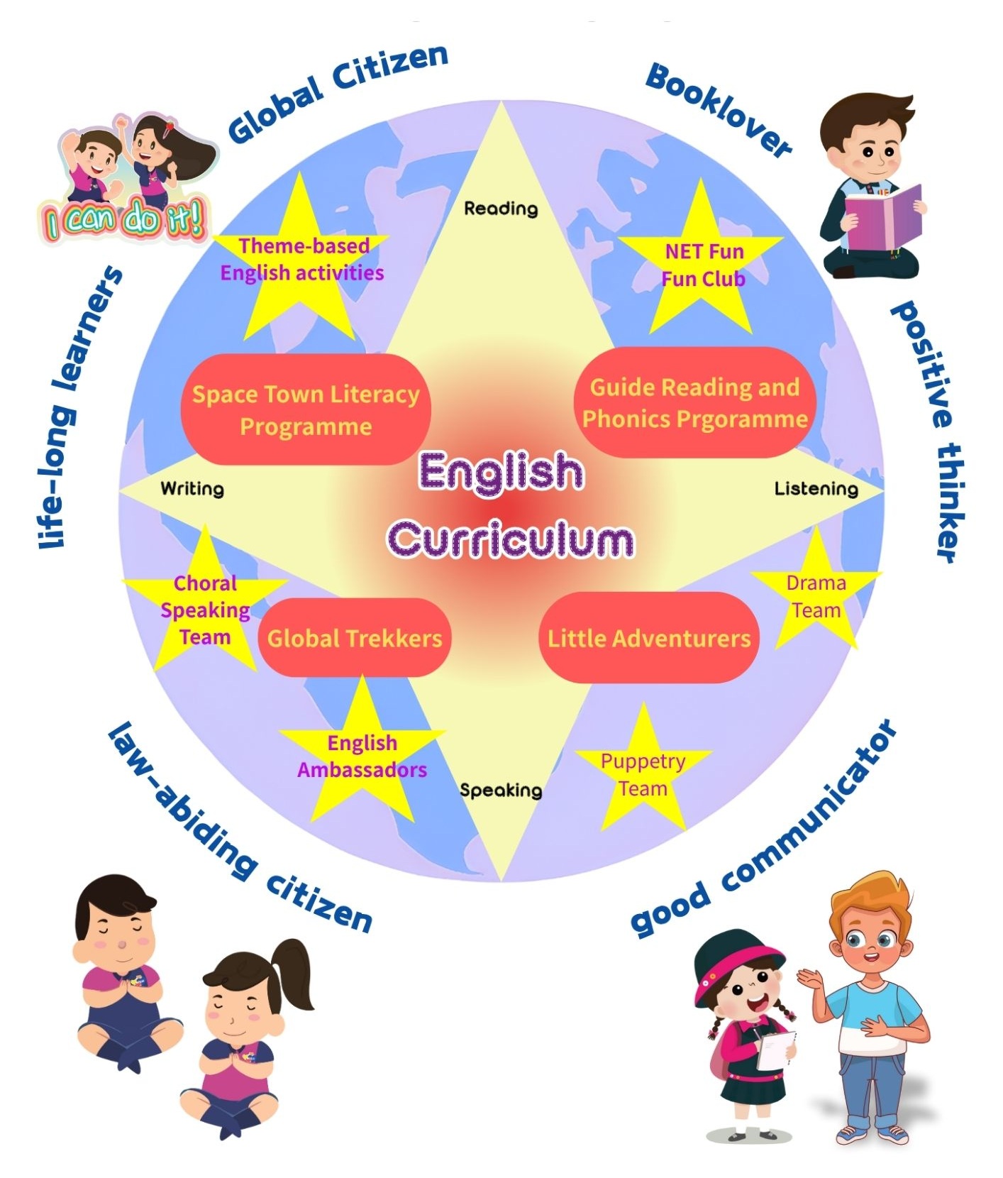 Our school-based English Curriculum has been created with the aim of developing students’ ability to use English to think and communicate as well as students’ phonetic skills, vocabulary building and presentation skills. We are also dedicated to: